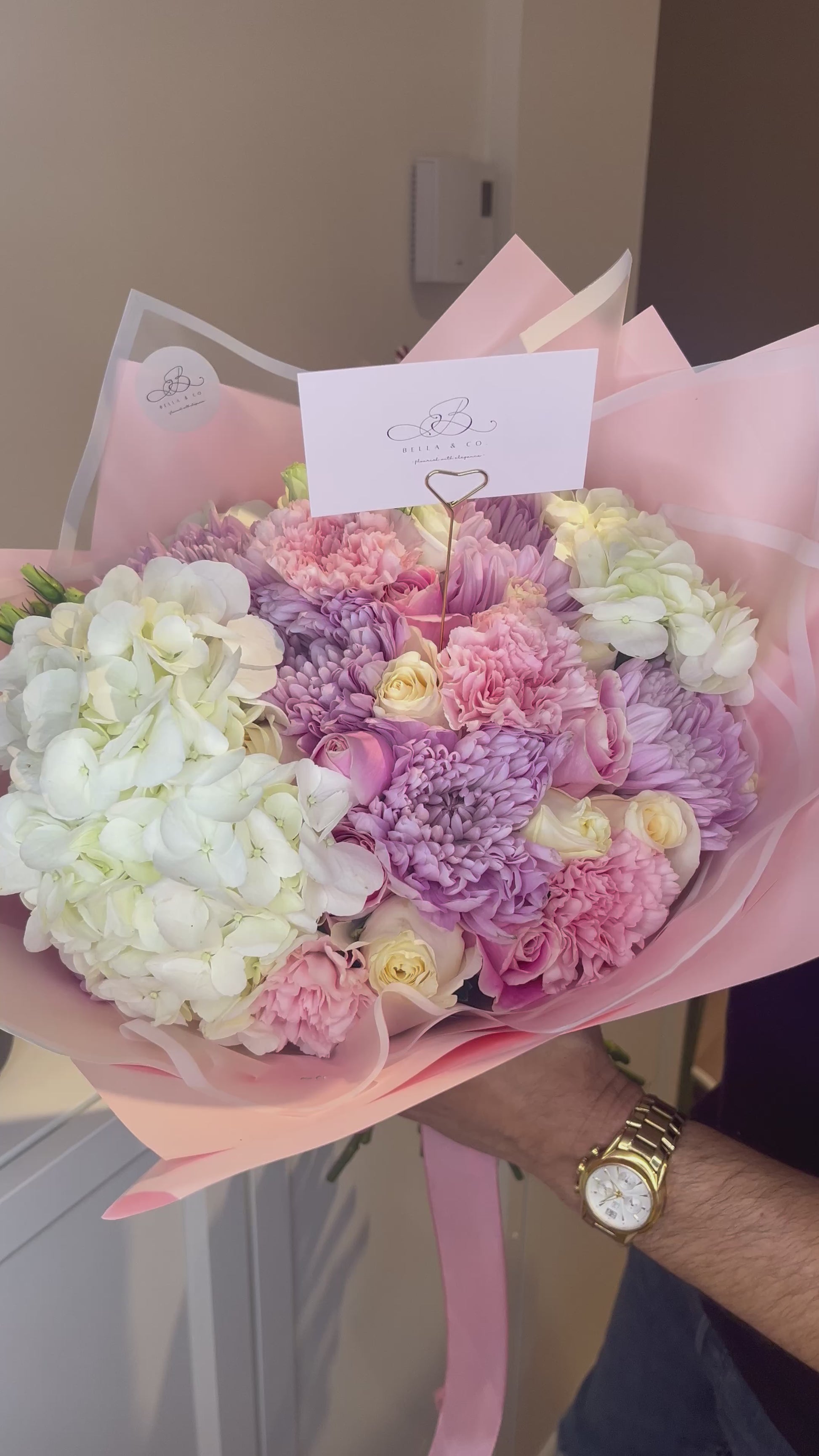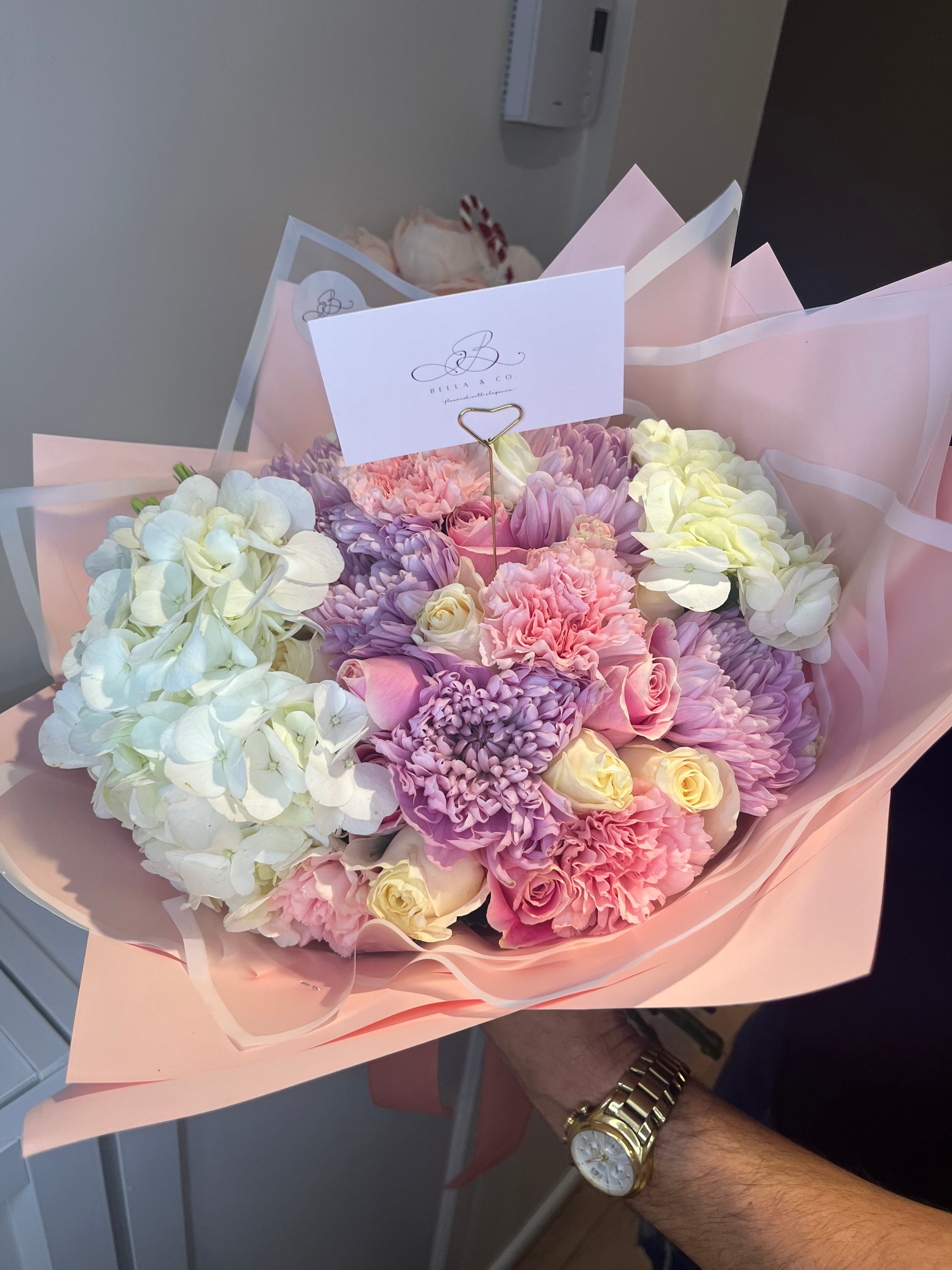 Discover Bella, the perfect flower bouquet for any occasion. Our expert florist chose shades of light pink, purple and white to create this elegant design. Let yourself be seduced by our favorite.